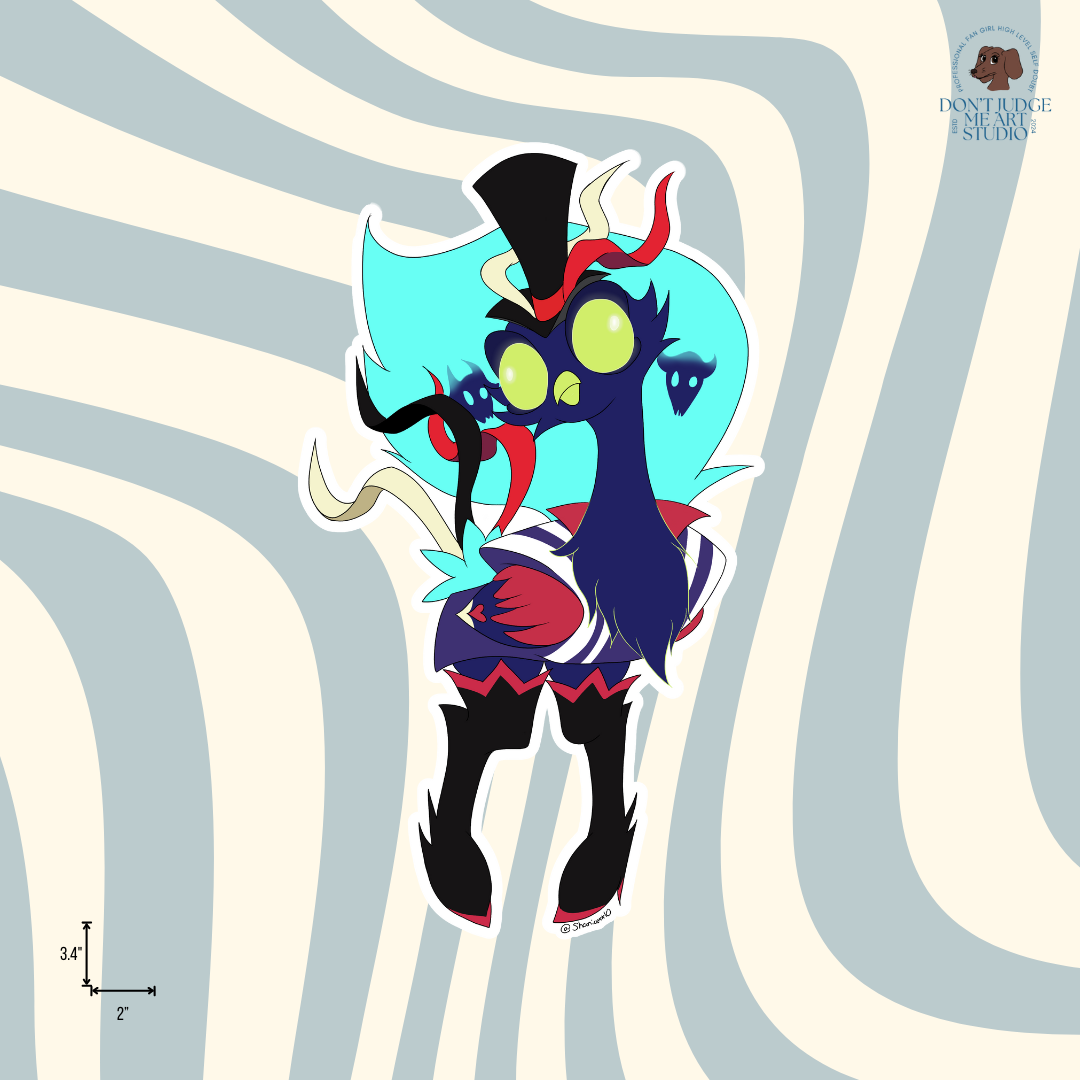 This one-of-a-kind fan art sticker showcases Asmodeus from Helluva Boss, depicted as a silly little burb! This high-quality, resilient, and waterproof sticker is ideal for adding a bit of demonic poultry flair to your laptop, water bottle, notebook, or wherever you want to display your affection for Ozzie and Helluva Boss.